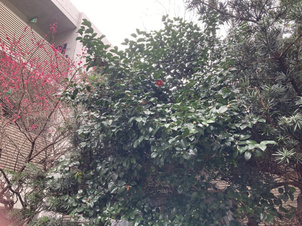 玄関わきのツバキの花がようやく咲いた。