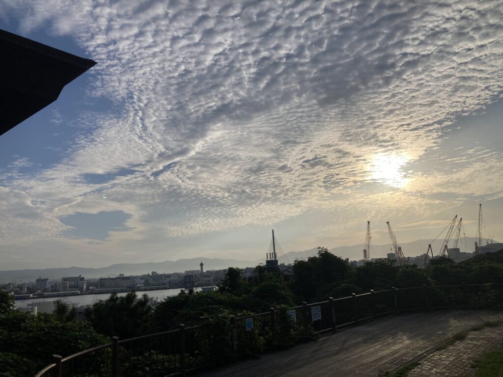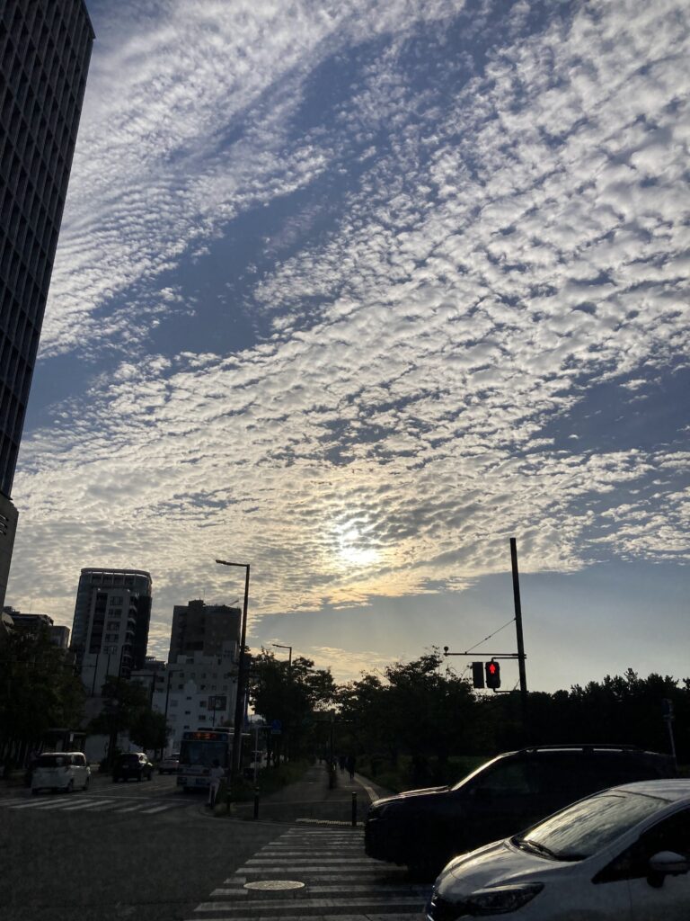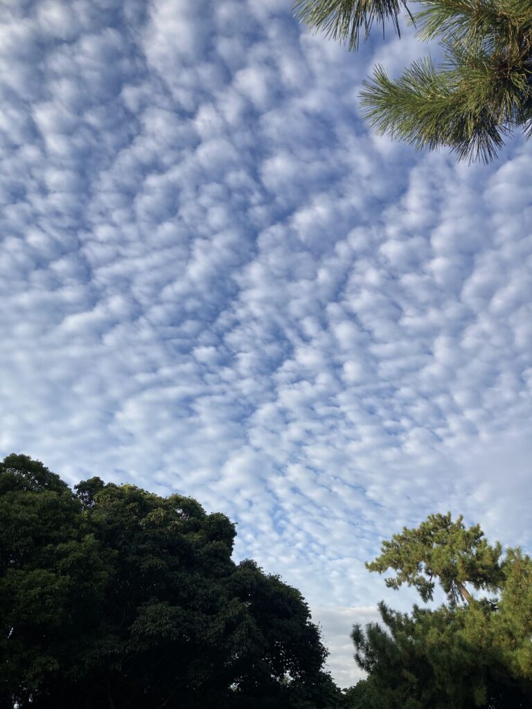 日の出が遅くなってきたな。目覚めると薄暗い。涼しいのだろうけど、そんな気はしない。ジョグすると滝汗だ。陽ざしがないからましなのか? 空はうろこ雲高い青空 秋の空だ!