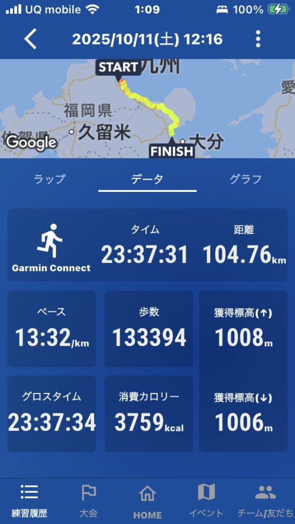総合1847位 女性では304位 ネットタイム23:25:44 12日の歩数74242歩