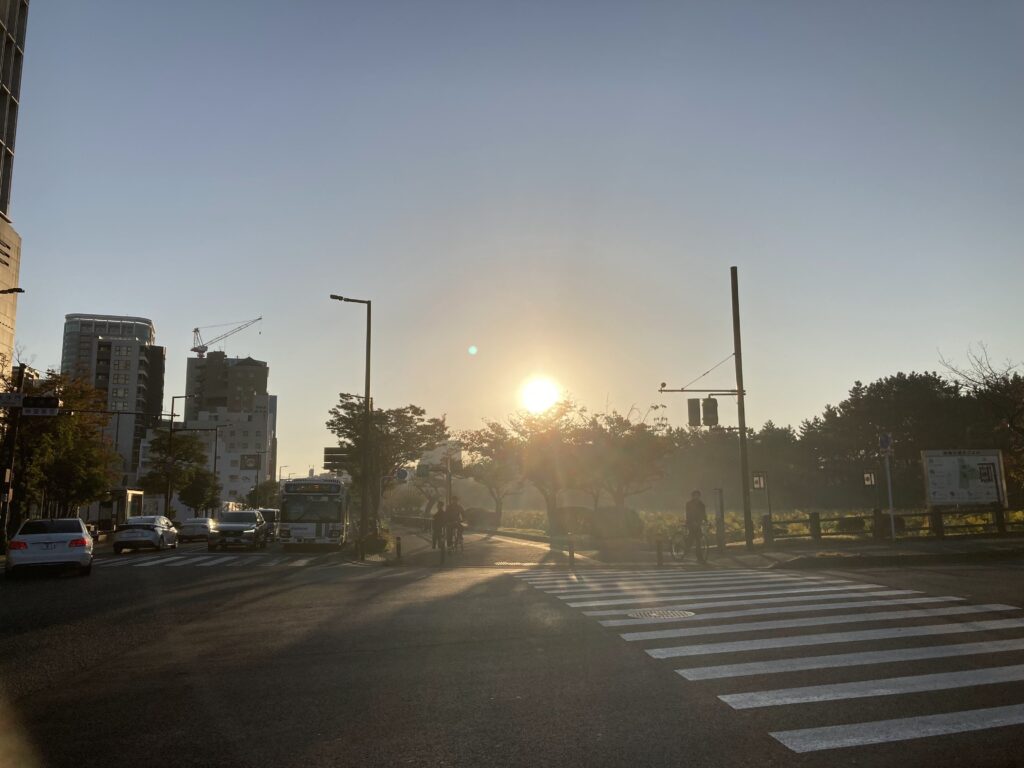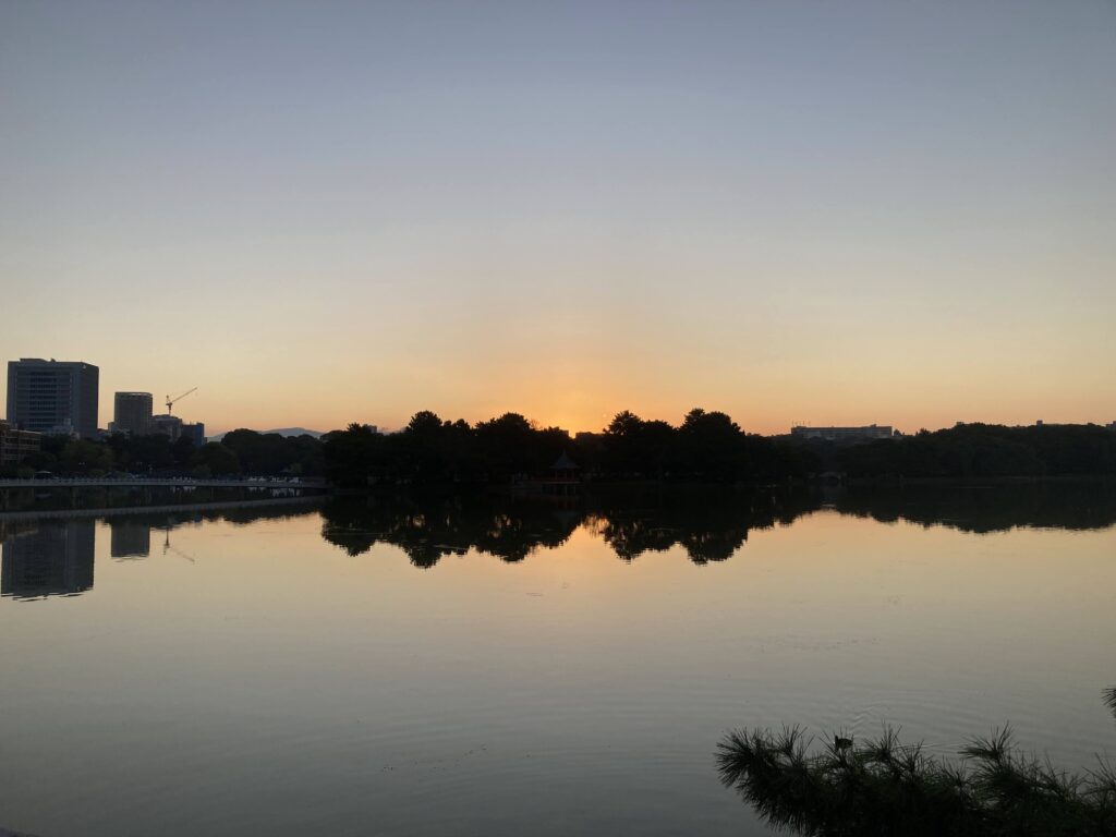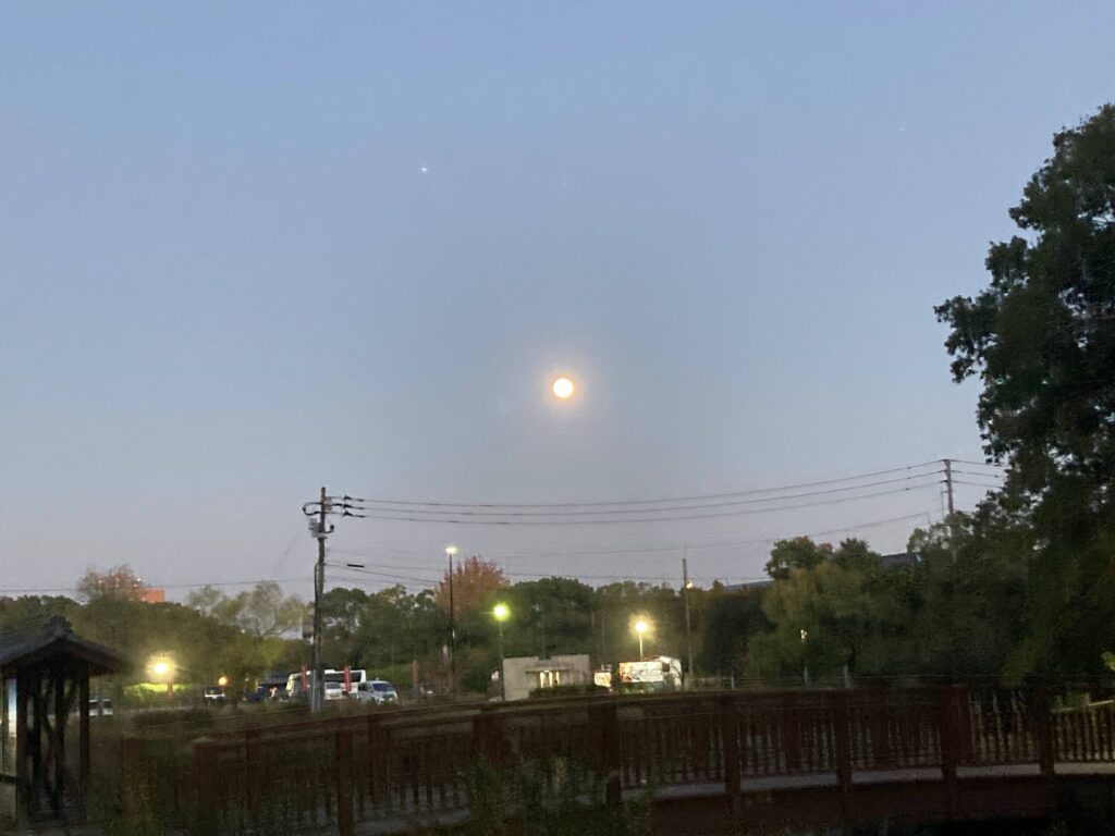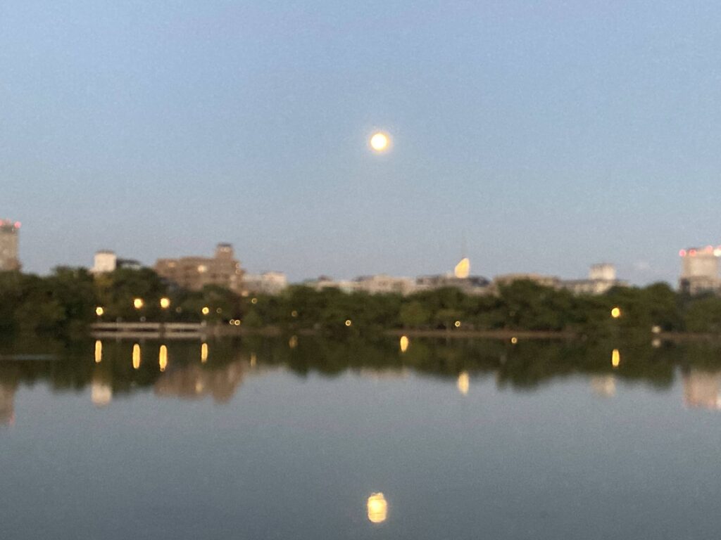 ジョグするのに走り出したら、西の空にまるいお月さまがポッカリと浮かんでいるではないか!大濠公園に行くと、福岡タワーの左上にスーパームーンが!太陽が福岡タワーに反射してまぶしく、私を含めそこいらの人がみんなスマホのカメラを向けていた。