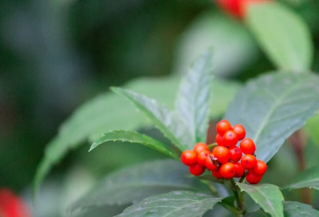 花言葉「富貴」「富」「恵まれた才能」は、センリョウの赤い実の美しさが百金にも勝ると言われたことが由来です。