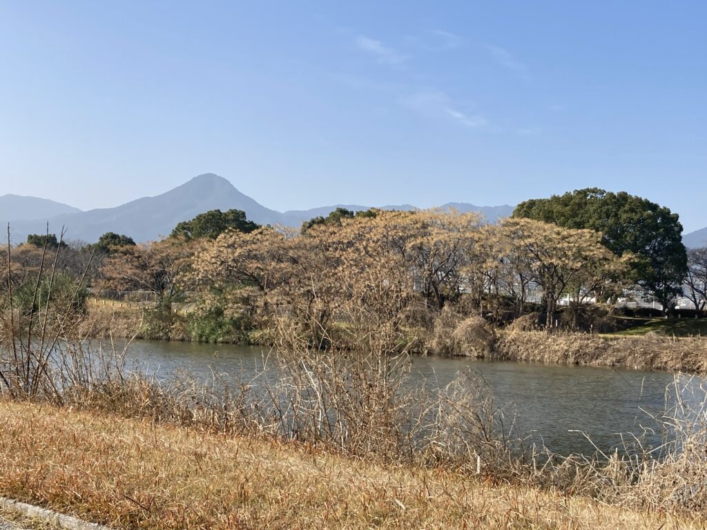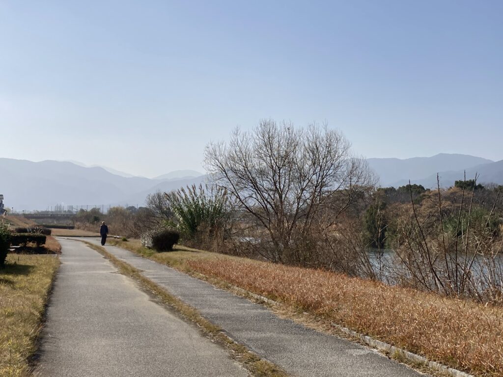 A山さんのウォーキング。室見川河川敷きを歩く。黄砂で背振がかすんで見えた。
