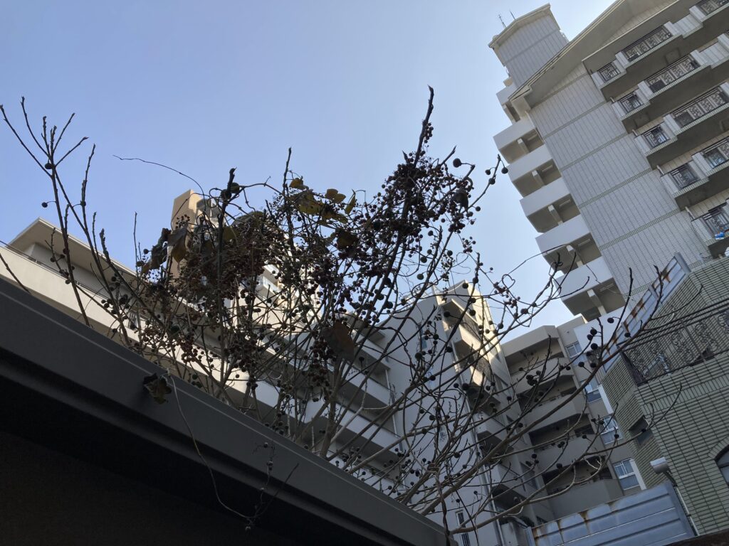 納戸の裏にたくましく育つ木 ヤドリギまで育っている