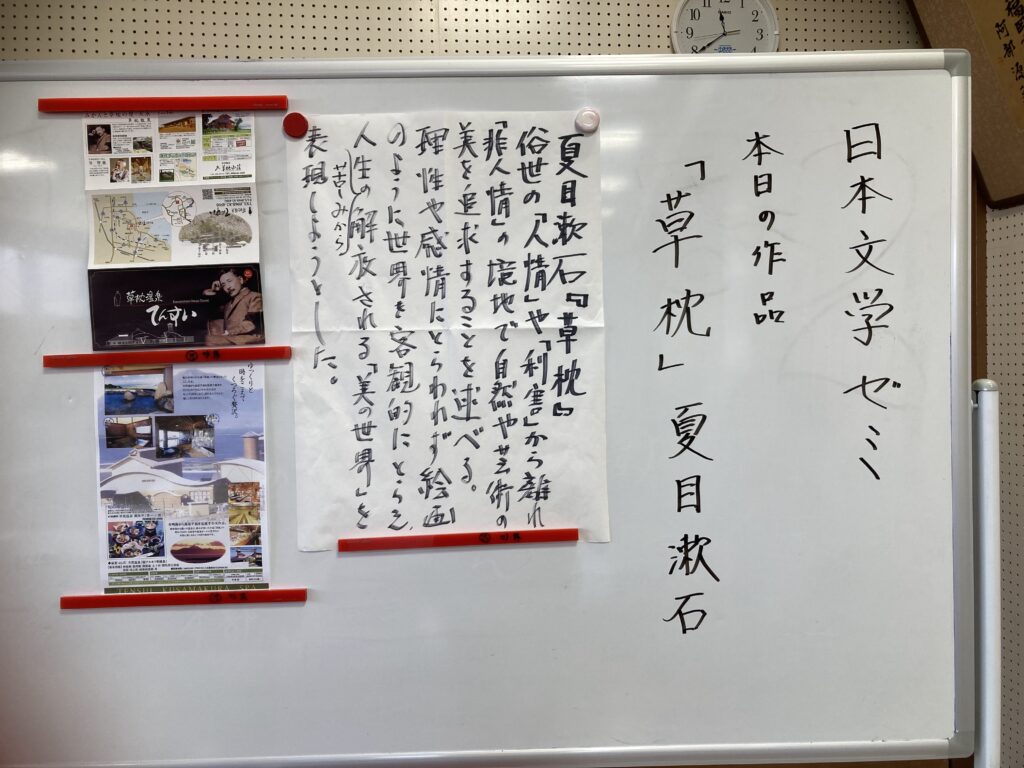 今日は船津先生の文学講座。夏目漱石の「草枕」智に働けば角が立つ 情に掉させば流される 意地を通せば窮屈だ とかく人の世は住みにくい の名文が入っている。