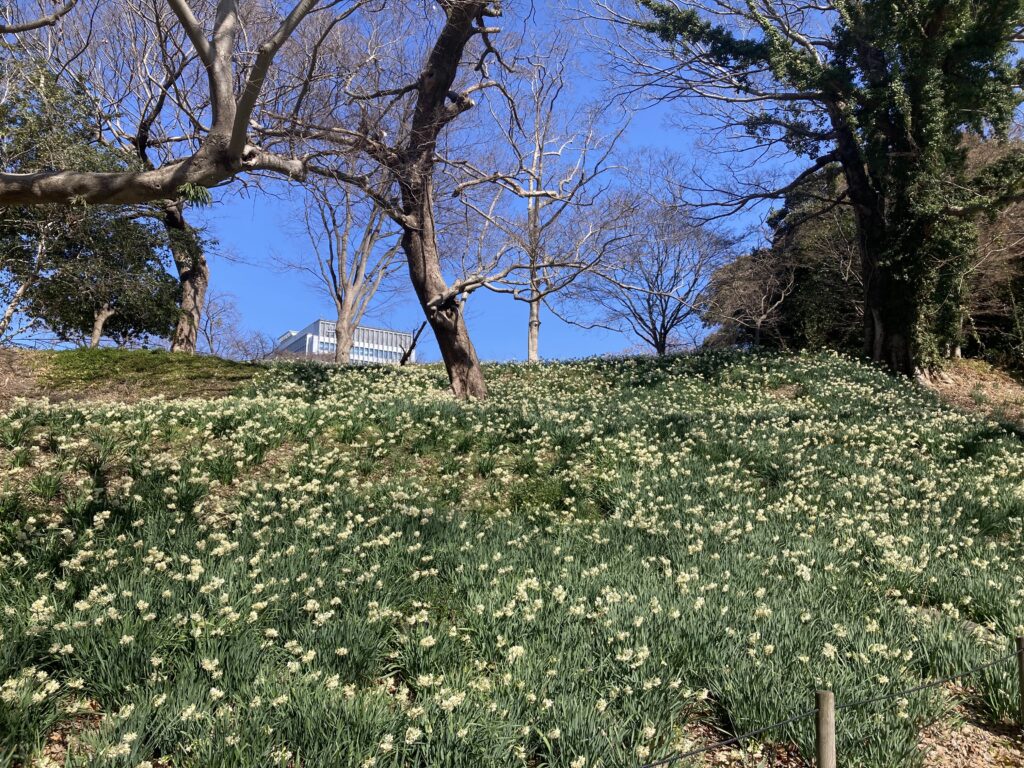 舞鶴公園の梅がきれいに咲き誇っている。土手の水仙もきれいだ。