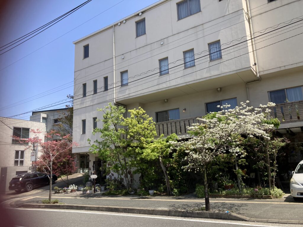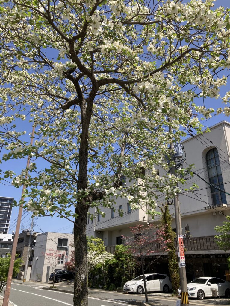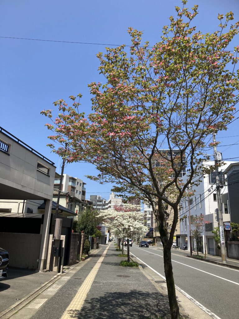 はなみずき通 向こうの歩道にカズ母の好きなヤマボウシ