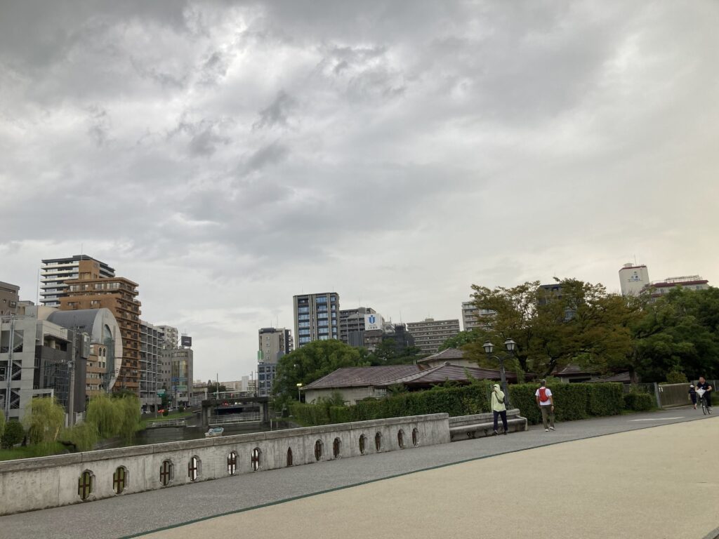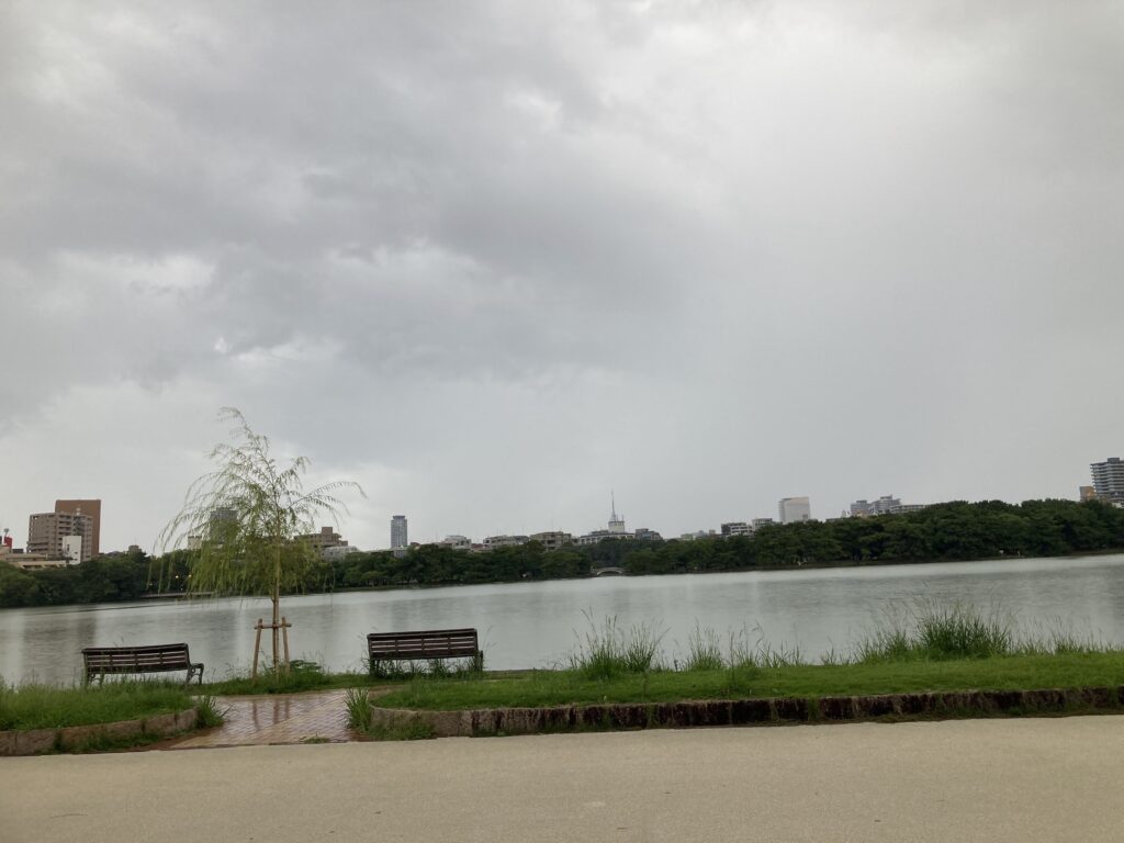 室見川河川敷に下りた途端に雨 すぐに滝雨 びっしょりぬれた。